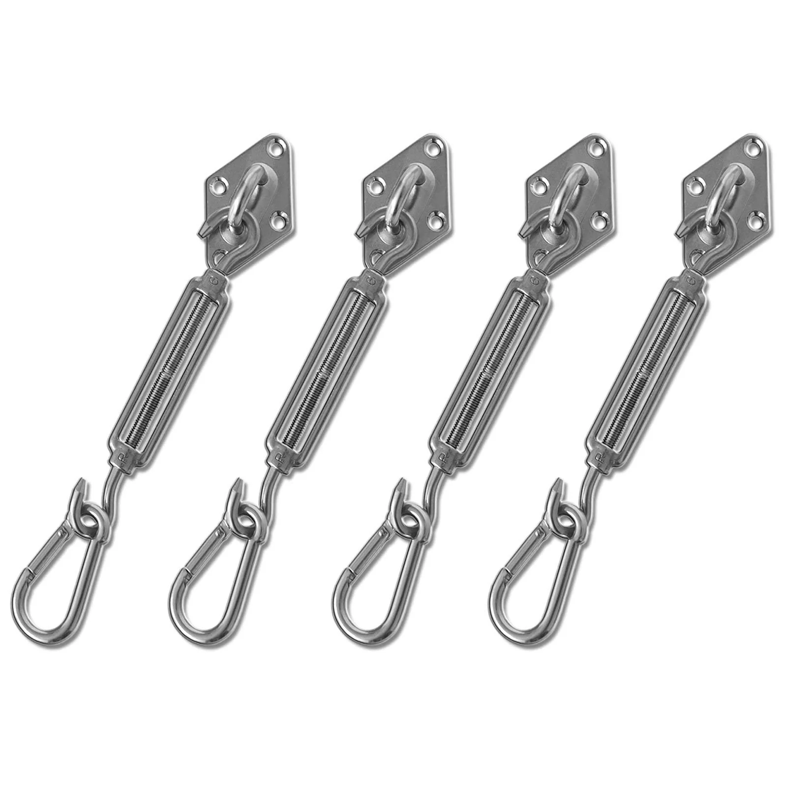 Afhankelijk van of u de montageset voor een rechthoekig of driehoekig schaduwdoek nodig heeft, ontvangt u de afzonderlijke onderdelen in drie- of viervoud om elke hoek van het zeil vast te zetten en te spannen. Voor beide tentvarianten is de juiste set beschikbaar.
