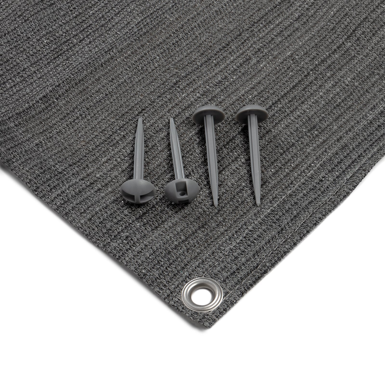 Met de bijgeleverde bevestigingsharingen kan het tenttapijt bijzonder gemakkelijk worden uitgelegd en bevestigd. De oogjes in de structuur helpen hierbij. Om duurzaamheid en een lange levensduur te garanderen, is het tapijt ook rondom dubbel omzoomd. Dit geeft het tapijt extra stabiliteit en voorkomt ongewenste beschadiging.