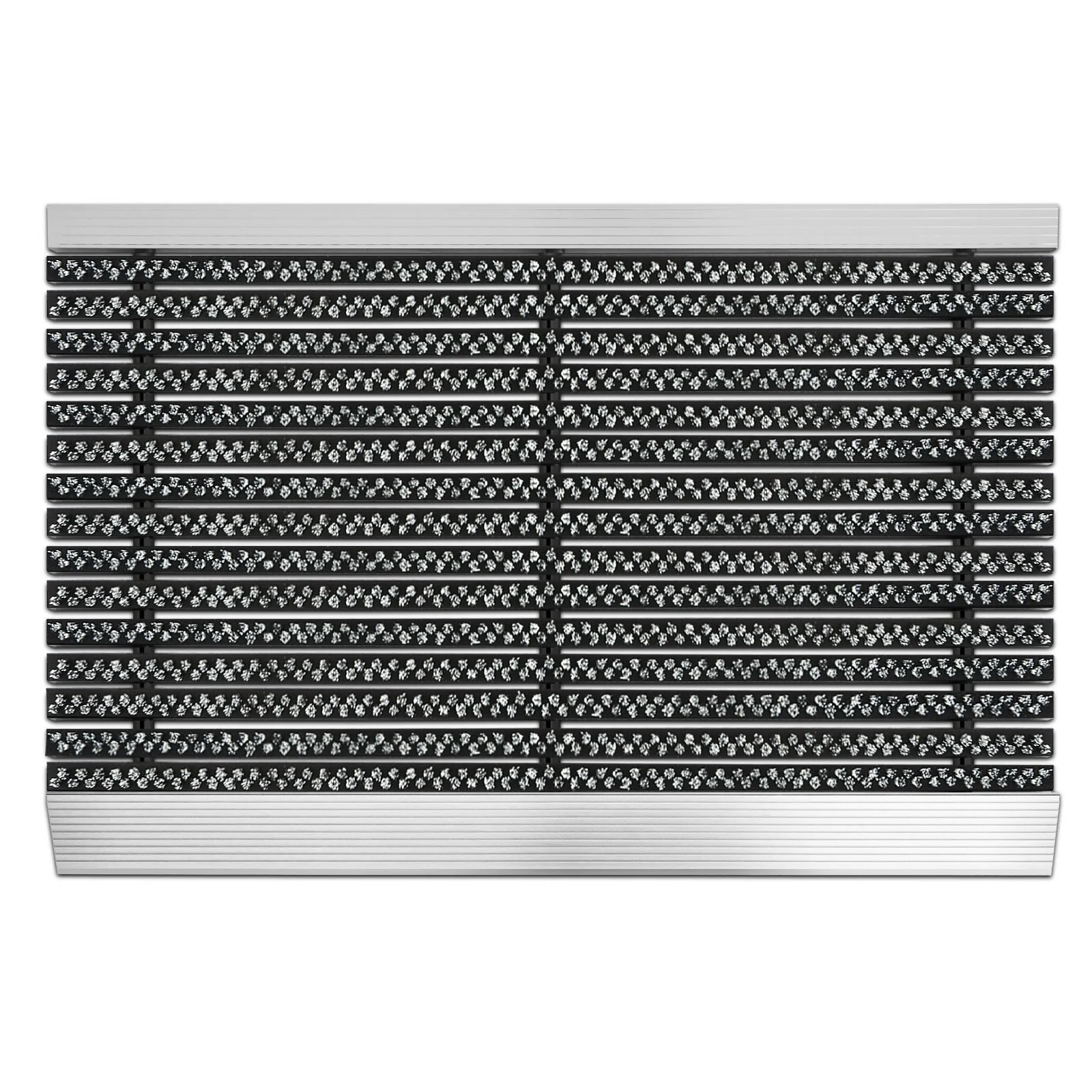 Het raam van aluminium laat de deurmat vast op de grond liggen. Verder zijn het metaal en de inzetstukken ongevoelig tegen weersinvloeden, zodat de beschermingsmat ook in overdekte buitenruimtes gebruikt kan worden.