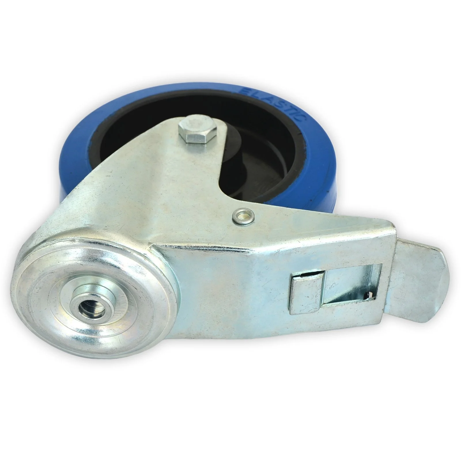 De blauwe transportrollen uit elastisch rubber zijn aan een stabiele behuizing van zinkplaat bevestigt. Deze is buitengewoon ongevoelig tegenover mechanische invloeden van buitenaf. Ter bevestiging van de zwenkwielen dient een boutgat aan de bovenkant van de metalen behuizing. Verkrijgbaar zijn deze transportwielen met of zonder een vastzetrem.