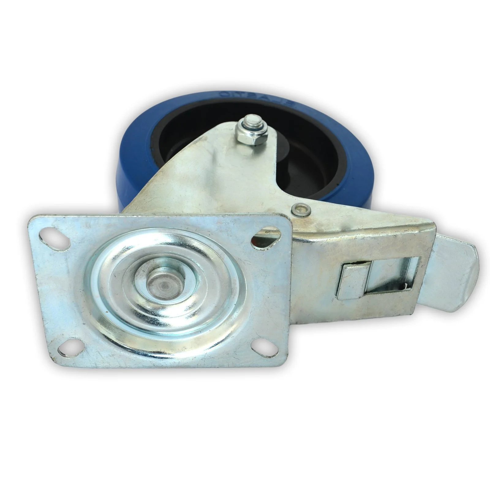 De blauwe transportrollen uit elastisch rubber zijn aan een stabiele behuizing van zinkplaat bevestigt. Deze is buitengewoon ongevoelig tegenover mechanische invloeden van buitenaf. Ter bevestiging van de zwenkwielen dient een plaat aan de bovenkant van de metalen behuizing. Met deze kunnen deze zwenkrollen vastgeschroefd worden. Verkrijgbaar zijn deze transportwielen met of zonder een vastzetrem.