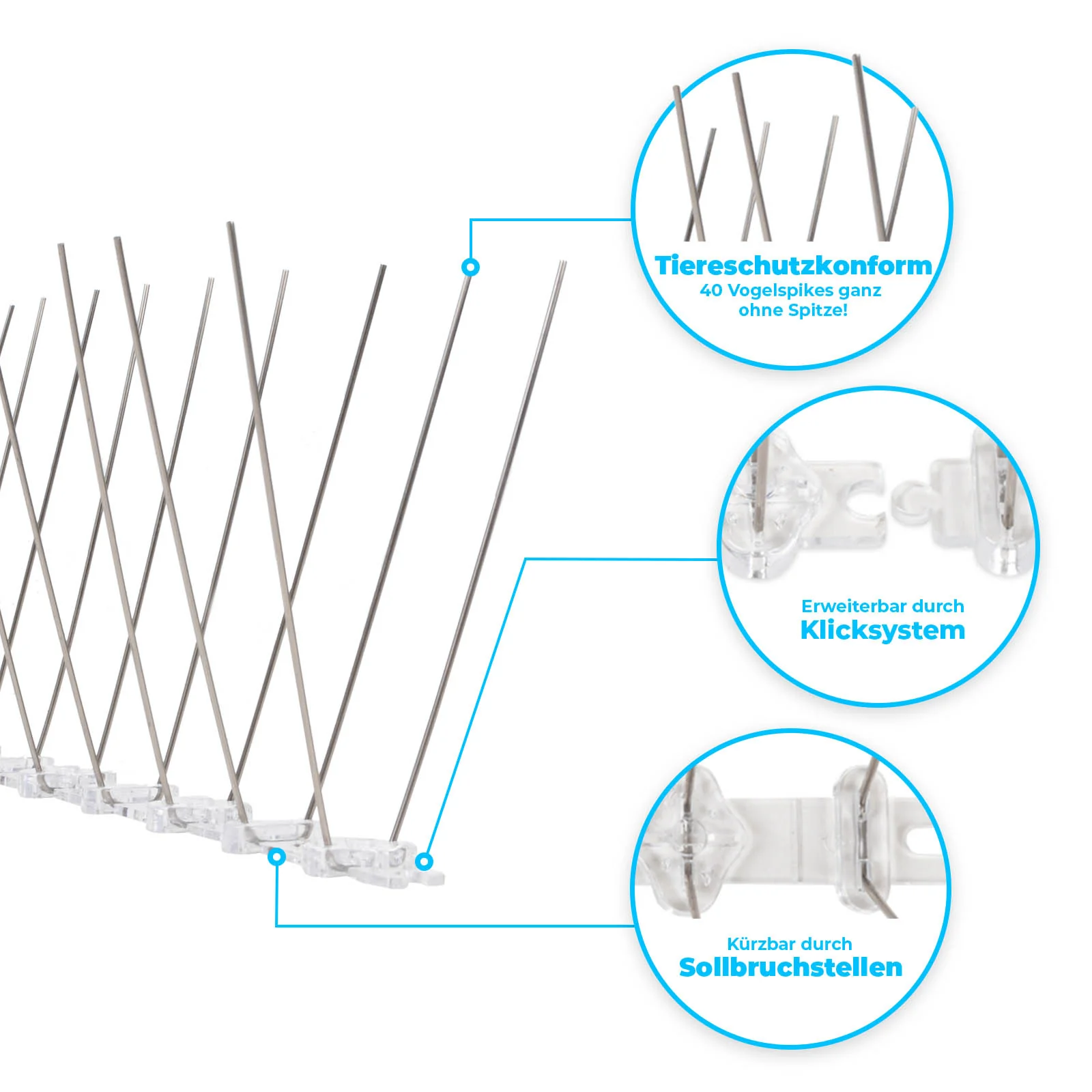 Met onze duivenpinnen voorkom je effectief dat duiven en andere vogels op je balkon, vensterbank of dak blijven zitten. Gemaakt van roestvrij staal, de spikes zijn extreem weerbestendig en daarom perfect voor gebruik buitenshuis. De vooraf bepaalde breekpunten die in de polycarbonaatstrip zijn verwerkt, maken een snelle inkorting mogelijk, wat de montage nog eenvoudiger maakt. De vogelverschrikker voorkomt dat duiven en andere vogels nestelen en is daarmee een bewezen middel tegen vervuiling van uw balkon, dak of andere buitenruimtes.